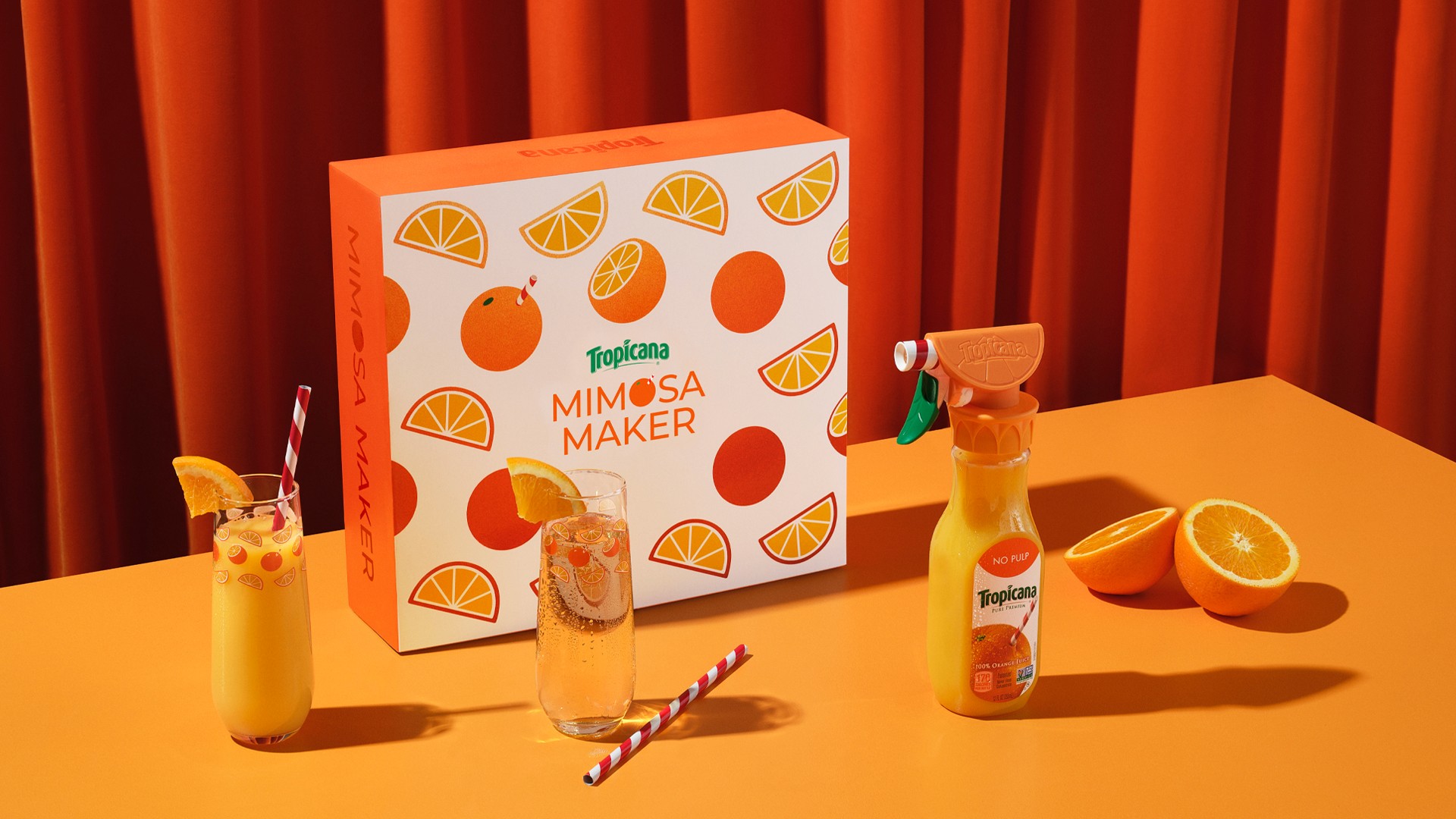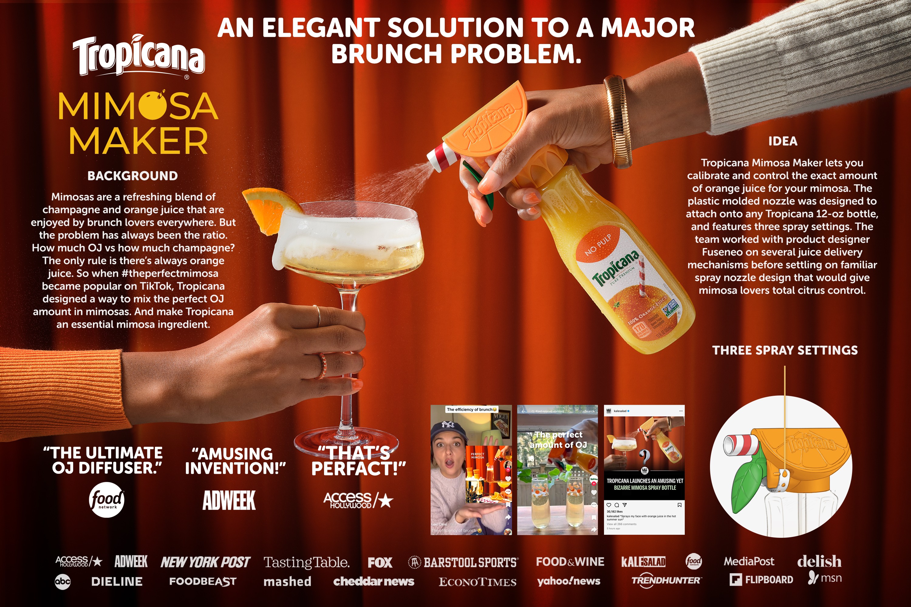 Social media could not agree on the perfect mimosa ratio. So Tropicana created the Mimosa Maker, an attachment that lets a Tropicana bottle deliver perfect parts OJ to mimosas. Simply screw on, set your spray setting to Whisper, Spritz or Shower, and squeeze yourself a perfect mimosa.